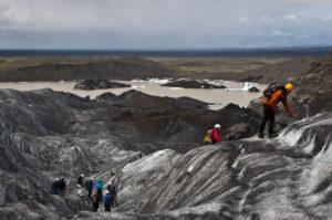 Vanuit Vík bogen we af naar het binnenland om een kijkje te nemen bij de kraterrijen van Lakagígar, zo’n honderd kraters waarvan de wanden sterk in kleur en grootte verschillen, de hoogste reikt tot 100 meter. In het dorpje Kirkjubæjarklaustur heeft Pater Jón Steingrímsson, volgens de legende, de toestromende lava van de Lakagígar met een vurige preek vlak voor de kerk tot stilstand gebracht. De volgende dag hadden we zicht op de grootste ijskap in Europa, Vatnajökull. Met een oppervlakte van ongeveer 8500 km² is deze gletsjer een imposant overblijfsel van de laatste ijstijd. Het mooie nationale park Skaftafell toont een aaneenschakeling van zeer diverse landschappen. Hoge bergen, gletsjers, diepe ravijnen, berkenbossen en heldere beekjes zorgden voor sterke contrasten. De bekende Svartifoss, de ‘zwarte’ waterval, stort zich hier van een wand van basaltblokken in het diepe. We hebben hier een spectakulaire wandeling gemaakt op een van de uitlopers van de Svinasfellsjokull gletsjer.